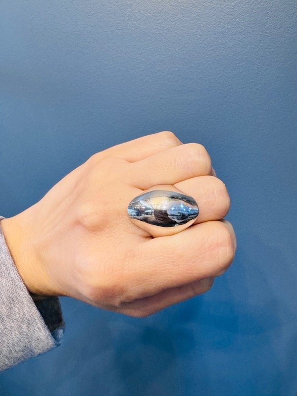 Este anillo de plata 925 tiene una superficie pulida como espejo y una forma envolvente que abraza el dedo con firmeza y elegancia. Su volumen liso y redondeado lo convierte en una pieza contemporánea, sobria, pero absolutamente llamativa.