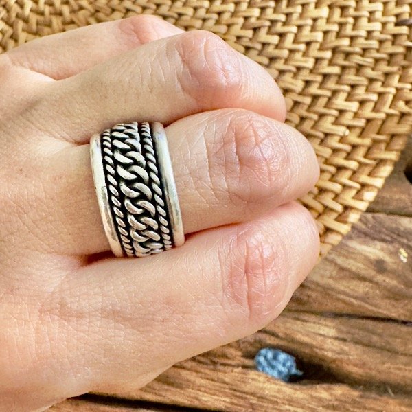 Se caracteriza por su robustez y el detalle de las filas de hilos y cadena que la componen.