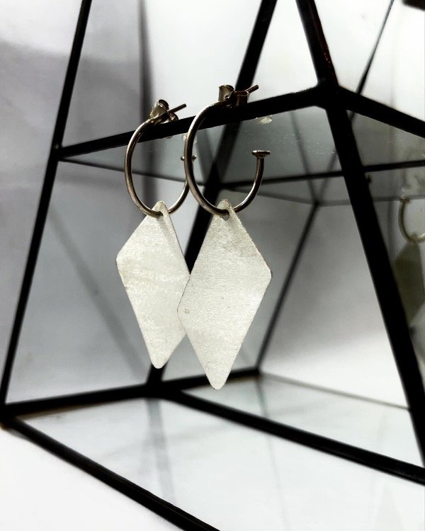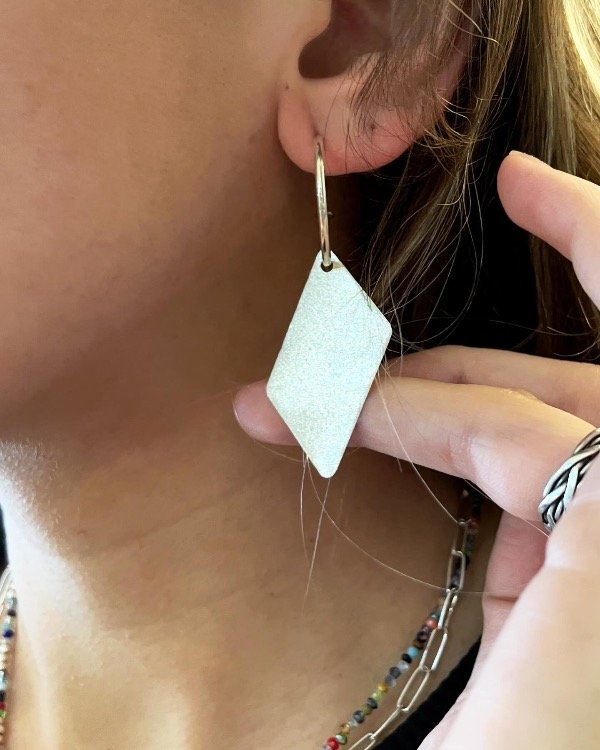 Estos aros combinan una base de media argolla en plata con un colgante geométrico que suma personalidad, textura y movimiento. La pieza pende de una delicada trabita, permitiendo un juego sutil entre lo estático y lo dinámico.