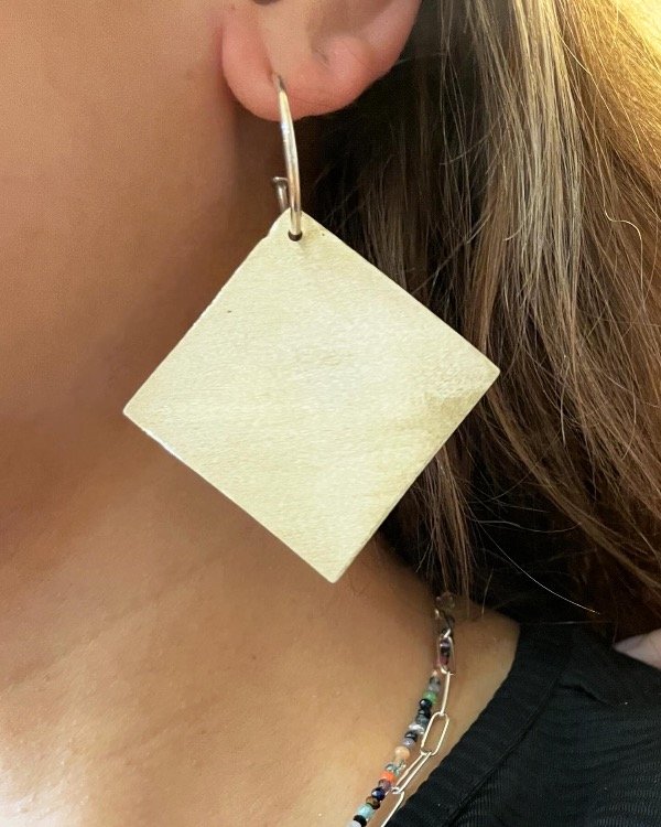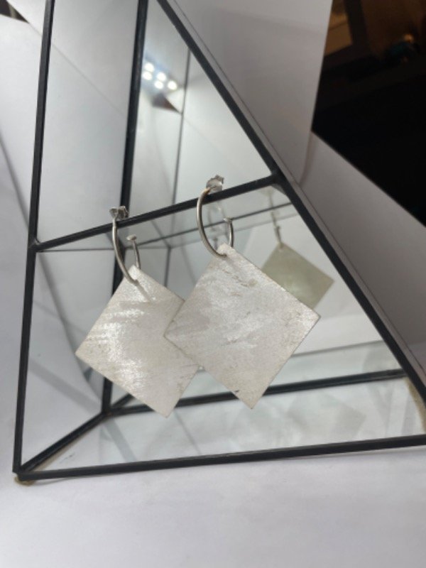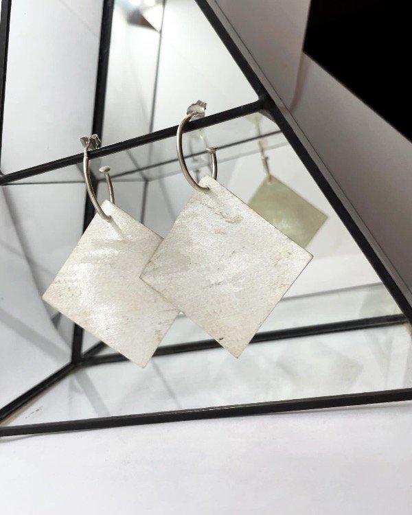 Estos aros combinan una base de media argolla en plata con un colgante geométrico que suma personalidad, textura y movimiento. La pieza pende de una delicada trabita, permitiendo un juego sutil entre lo estático y lo dinámico.