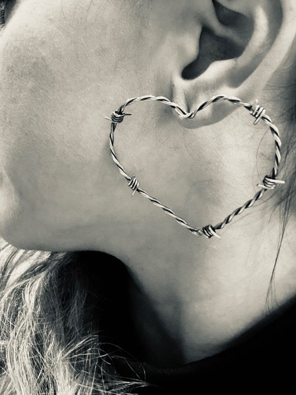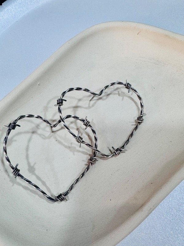 Par de Aros pasantes, de plata 925 en forma de corazón tipo alambre de púas .