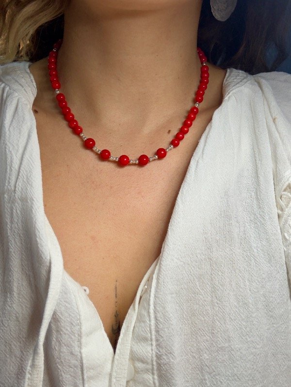 Choker de bolitas de Coral y de plaga y cierre de plata 925. La correa interna es de acero, lo que le proporciona mayor durabilidad.