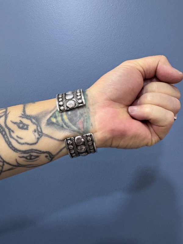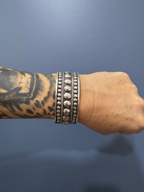 Este brazalete ancho de plata celebra lo tribal, lo ancestral y lo contundente. Su textura rica en relieves y líneas marcadas convierte a esta joya en un símbolo de autoridad y autenticidad.