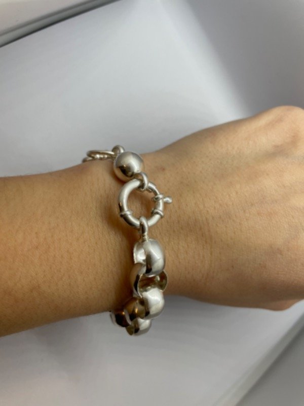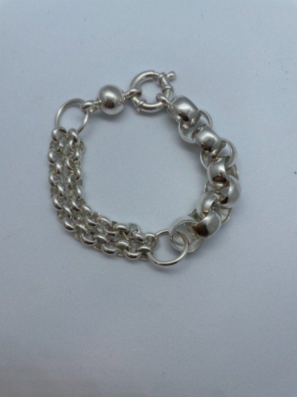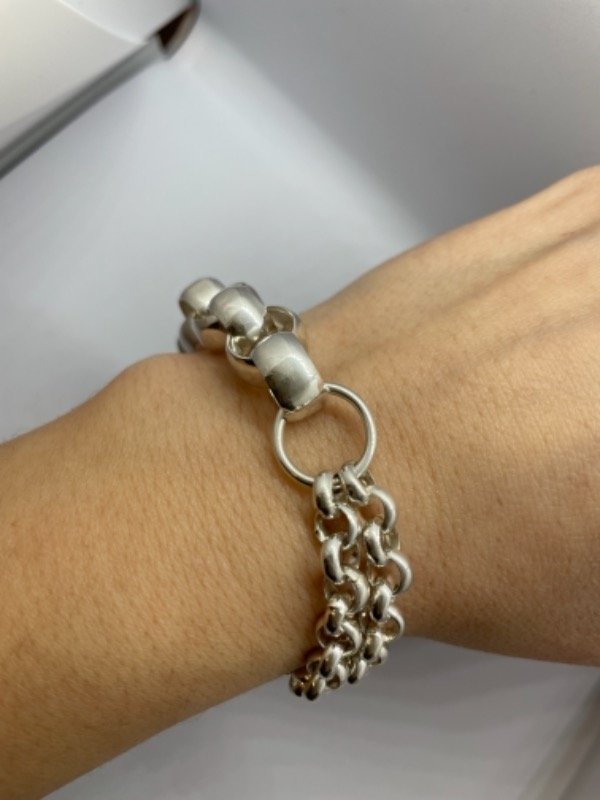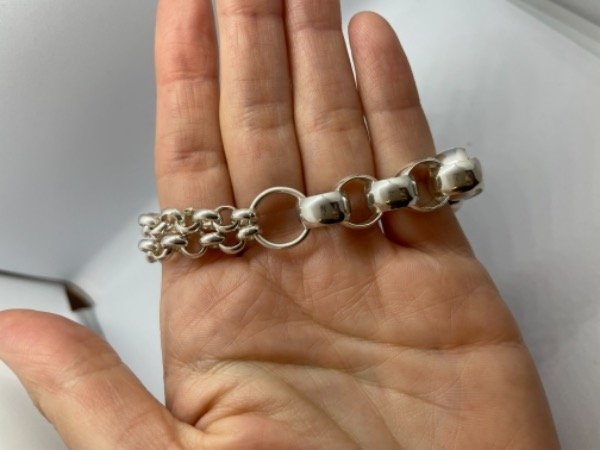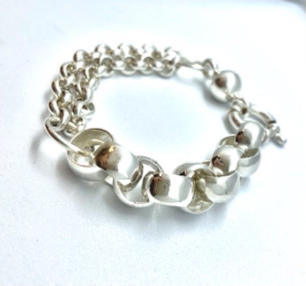 Se trata de una pulsera combinando dos tipos de roló. unidas con una argolla