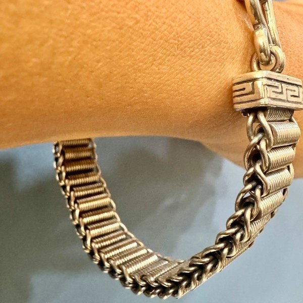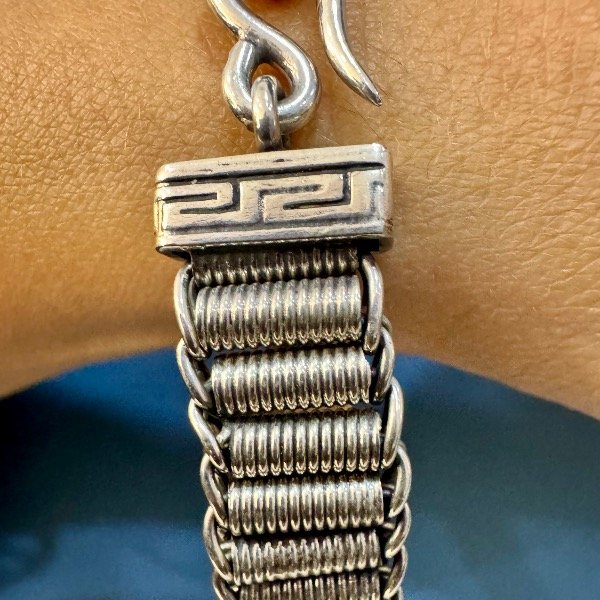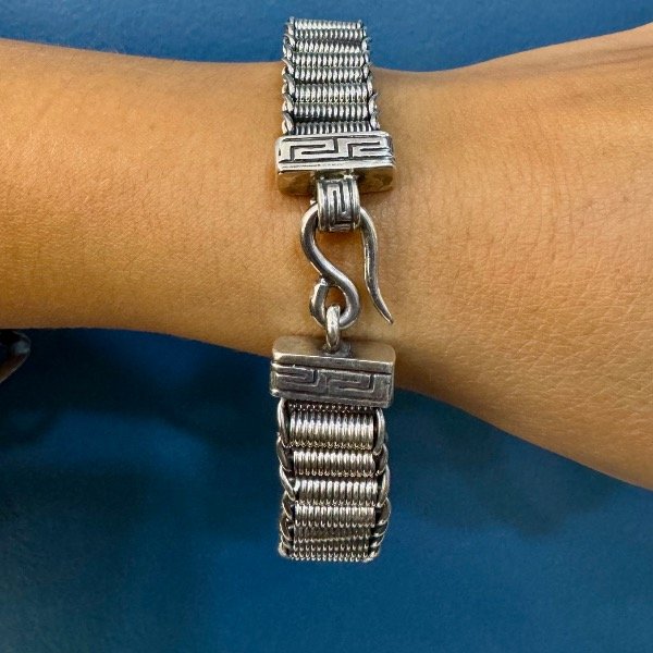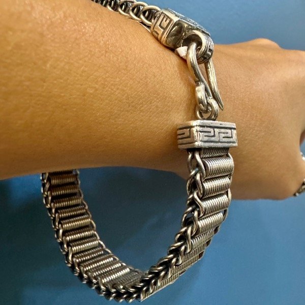 Realizada a mano en plata 925 con terminales con motivo de guarda griega y gancho pasante.