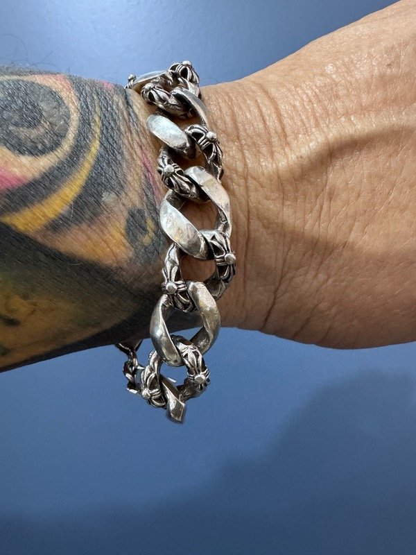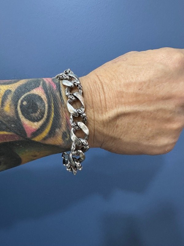 Esta pulsera de plata maciza se destaca por su diseño robusto y su ornamentación gótica: flores, relieves y eslabones gruesos que transmiten fuerza, historia y presencia.